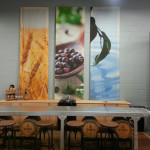 Large stretched canvas panels were included in the background design with colorful imagery so that the bar would be a focal point for visitors’ eyes in contrast to the gray-scale machinery that surrounded it. Casks of whiskey were used to fill in the empty space below the conveyor belt so that it became a solid structure and the branding was evident. The casks also provided a talking point for the tour guides to talk about the aging process and to push the “Age Your Own Whiskey Kits” that the distillery sold.
